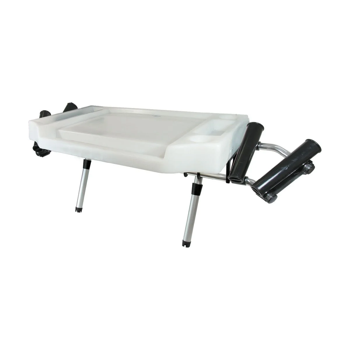 All-in-one complete angler’s centre with easy installation and removal into two existing fixed rod holders. New quick release anodised aluminium rod holders that enable tension to be maintained on the line while removing the rod. Pivoting universal enables the cutting/bait board to set at a convenient working angle. Manufactured from super tough U.V. stabilised rotomoulded polyethylene, aluminium, black HDPE and glass filled nylon so they can be simply hosed off to clean at the end of the days fishing. Cutting surface resists cuts and abrasions whilst retaining knife edge. All models include a recessed tray for storage of knives, tackle or offal run off, with the medium and large models featuring two recessed drink holders and storage trays. Includes alloy legs.